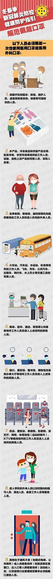 除從事醫(yī)療衛(wèi)生、冷鏈?zhǔn)称?、公共交通、公共服?wù)場所等特定行業(yè)和領(lǐng)域工作人員必須佩帶口罩外,浙江還明確要求,到醫(yī)療機(jī)構(gòu)就診、探視、陪護(hù)的人員或者其他有發(fā)熱、咳嗽等可疑癥狀者,進(jìn)入學(xué)校和養(yǎng)老院、敬老院、福利院等機(jī)構(gòu)的外來人員,進(jìn)入商場、超市、酒店、賓館等場所的人員,進(jìn)入銀行、展覽館、圖書館、博物館及各類辦事大廳的人員,進(jìn)入藥店、理發(fā)店、美容院、影劇院、游藝廳、網(wǎng)吧等密閉場所,以及進(jìn)入廂式電梯等通風(fēng)不良場所或旅游景區(qū)售票處等人員密集場所的人員,應(yīng)當(dāng)佩帶口罩。同時(shí),對(duì)年老體弱者、慢性疾病患者外出,在公園、夜間集市等戶外人員密集公共場所,以及雖無人員聚集但空間密閉的室內(nèi)公共場所,建議佩帶口罩。