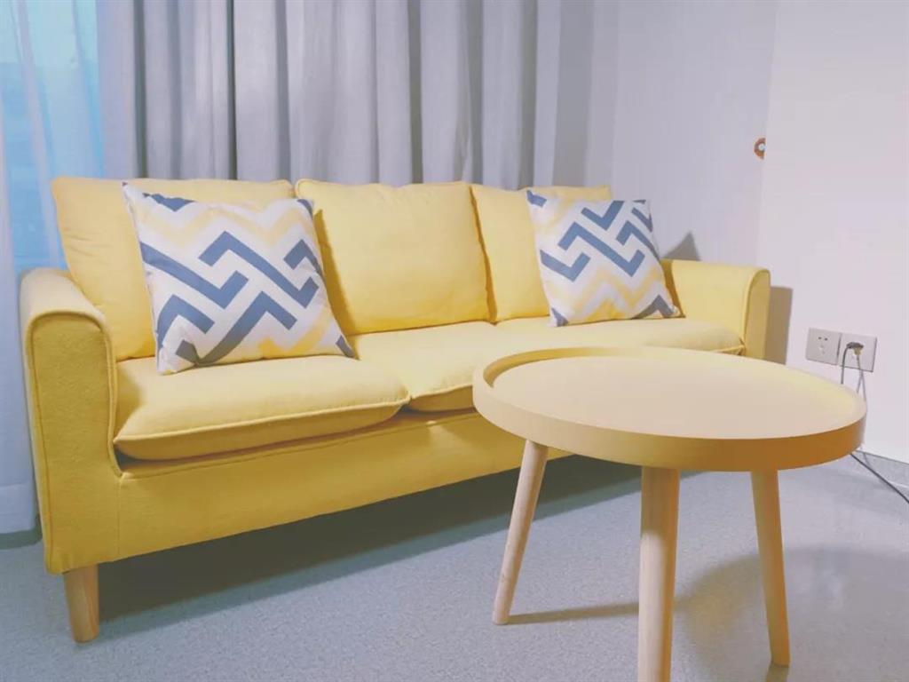 黃色的布藝沙發(fā)和藍(lán)色的茶幾讓人心情舒緩