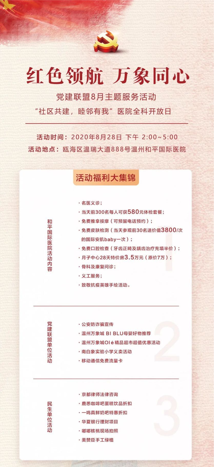 8月28日,甌海區(qū)南白象街道“紅色領(lǐng)航 萬象同心”黨建聯(lián)盟聯(lián)合多方力量,將在和平國際醫(yī)院舉行全科開放日活動(dòng),現(xiàn)場(chǎng)有近20家黨建聯(lián)盟單位及愛心商家,共計(jì)提供30多項(xiàng)福利,寓教于樂,縱享精彩。