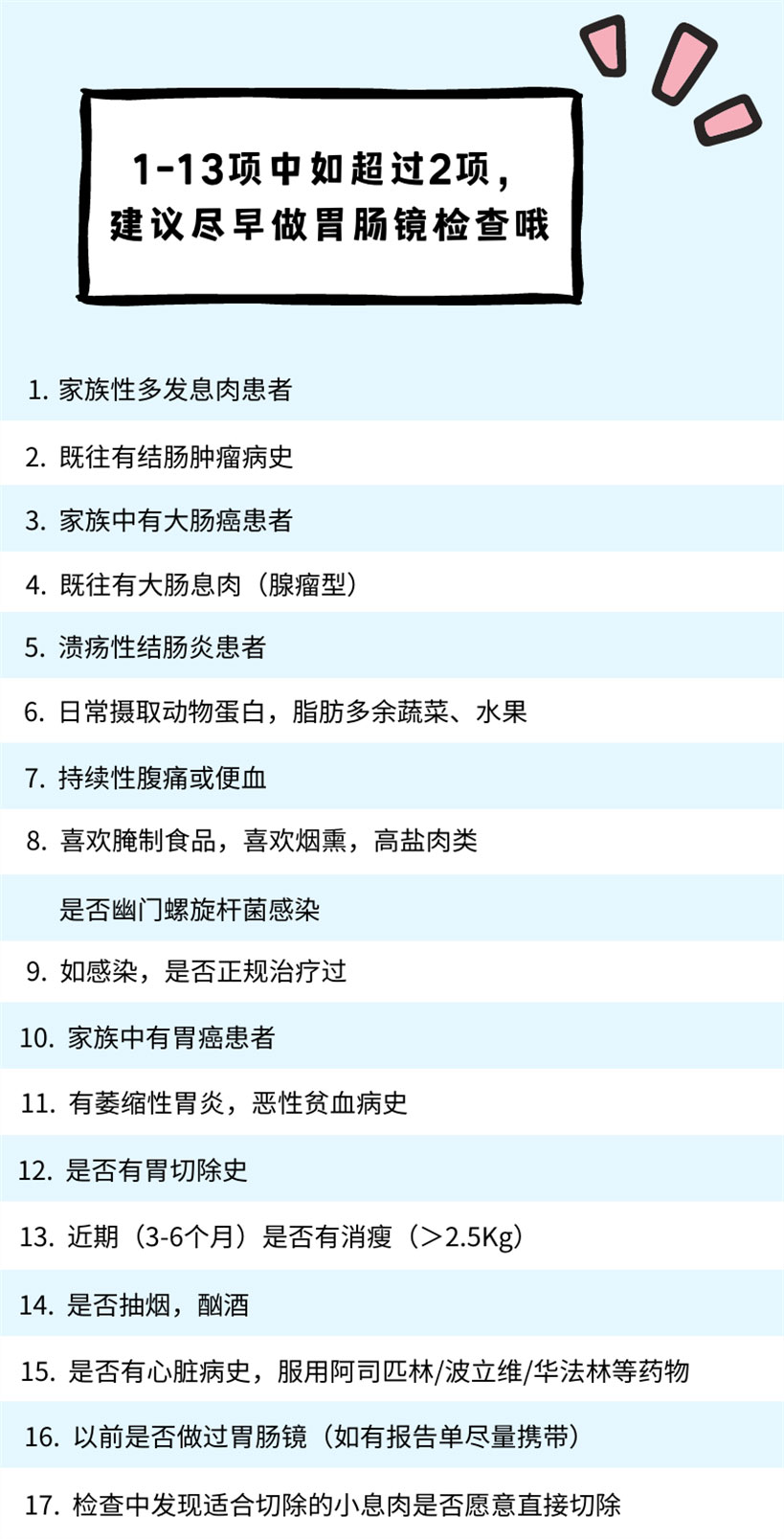 下面這個自查項目大家可以根據(jù)自身情況來初步判斷哦,不過最終是否適合做無痛胃腸鏡,還需要醫(yī)生親自做評估。