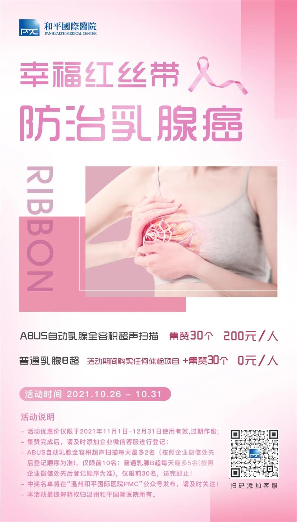 借著每年10月被定為“乳腺癌防治月”的契機,溫州和平國際醫(yī)院發(fā)起“幸福紅絲帶,防治乳腺癌”活動,免費贈送“普通乳腺B超”項目和超優(yōu)惠價享受“ABUS自動乳腺全容積超聲掃描”項目,活動規(guī)則如下: