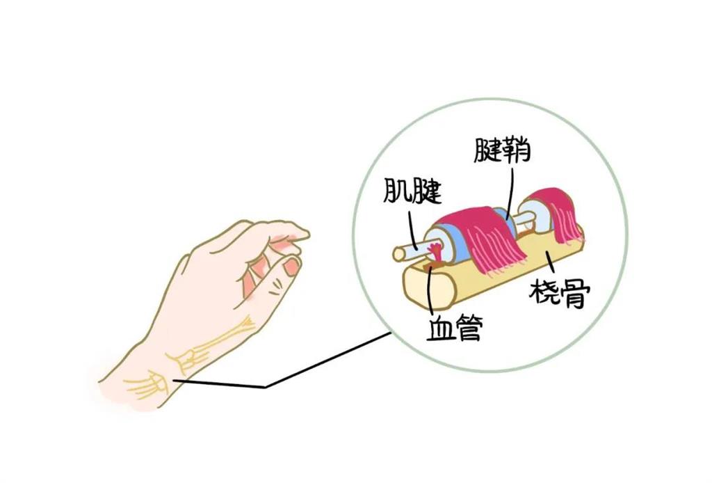 我們先來看一下雙手漂亮的“骨感”圖,這是雙手主要骨頭組成部分。骨頭外面覆蓋了肌肉、血管、神經、筋膜、皮膚等組織。腱鞘,就是指纖維鞘+指滑膜鞘的雙層套管樣結構,對肌肉的肌腱起約束、支持和滑車等作用。所謂腱鞘炎,就是指肌腱及其周圍覆蓋組織發(fā)生炎癥。腱鞘炎最常發(fā)生于手部或腕部,但也可發(fā)生于身體其他部位,如踝部。