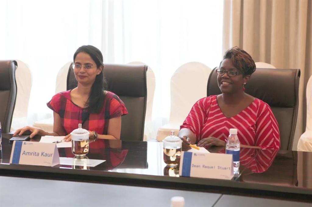 來訪代表為溫州肯恩大學人文學院院長Dean Raquel Stuart(下圖左三)、心理學教授Amrita Kaur(下圖左二)、院長助理項冰靈Evangeline(下圖左一)。